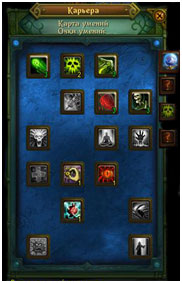При достижении нового уровня персонаж получает по одному Очку Умений, которое можно оставить, тем самым накапливая очки умений с каждым уровнем, а можно вложить в любое из доступных ему умений на данный момент, которые находятся в Карте Умений. Изначально (на первом уровне персонажа) в Карте Умений доступна только одна линия умений из шести. Каждые 5 уровней открывается новая строка с умениями. На 30 уровне будут доступны все возможные умения для персонажа, и останется только распределять очки умений для выбранного направления развития. На одной линии расположено по три умения, которые можно улучшить до первого, второго и третьего ранга, для этого нужно последовательно вложить одно, два и три очка умений в любое умение.